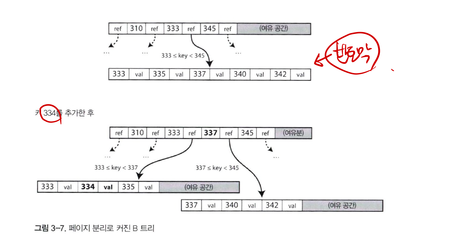 - 이 때, 새로운 키를 수용할 공간이 없을 때 페이지 하나의 내용을 두 개의 페이지로 분할 후,