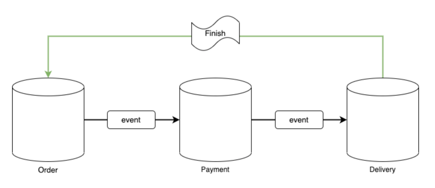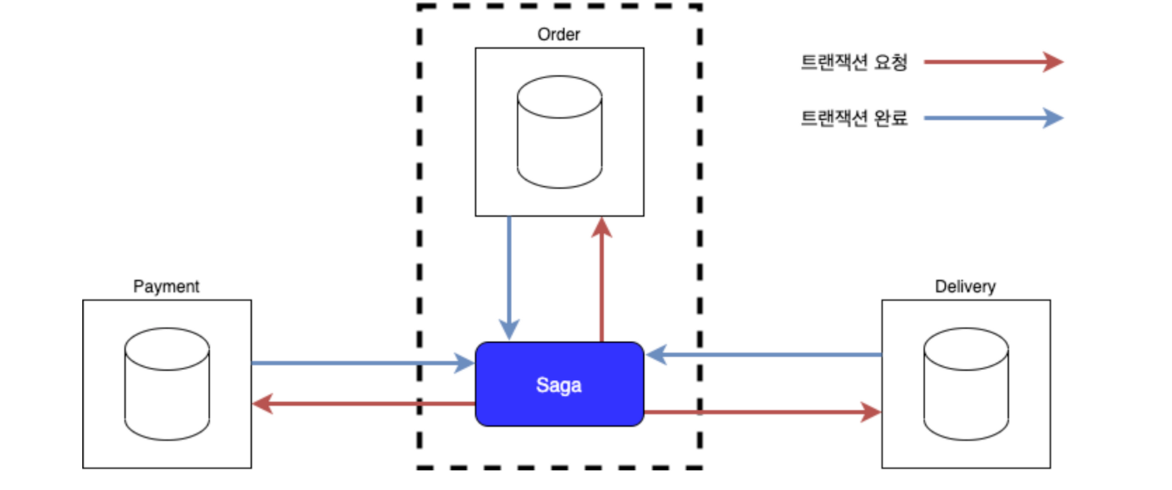- 자신이 보유한 서비스 내 DB만의 트랜잭션을 관리, 트랜잭션 종료 → 완료 이벤트 발행