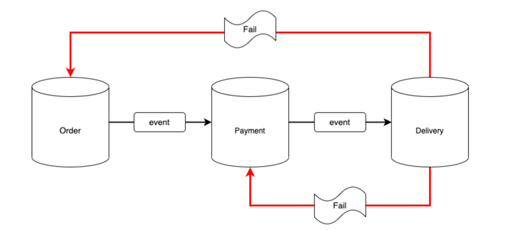 → 중간에 트랜잭션이 실패하면 해당 트랜잭션 취소 처리를 실패한 어플리케이션에서 보상 Event 발행