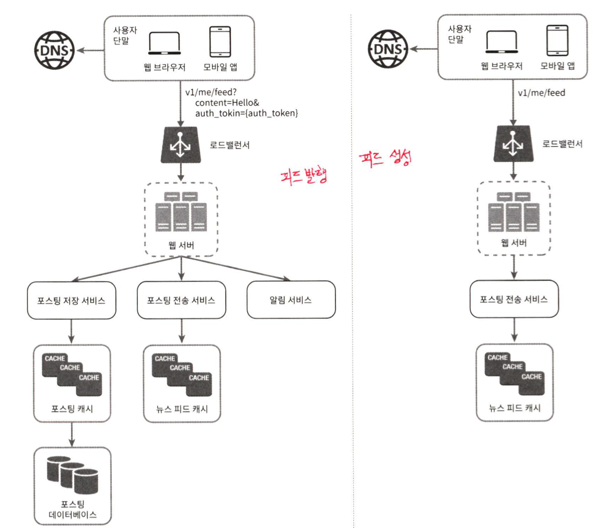 - 피드 발행 : 사용자가 포스트를 올리면 관련된 데이터가 캐시/데이터베이스에 기록되고, 해당 사용자의 친구 뉴스피드에 뜬다.