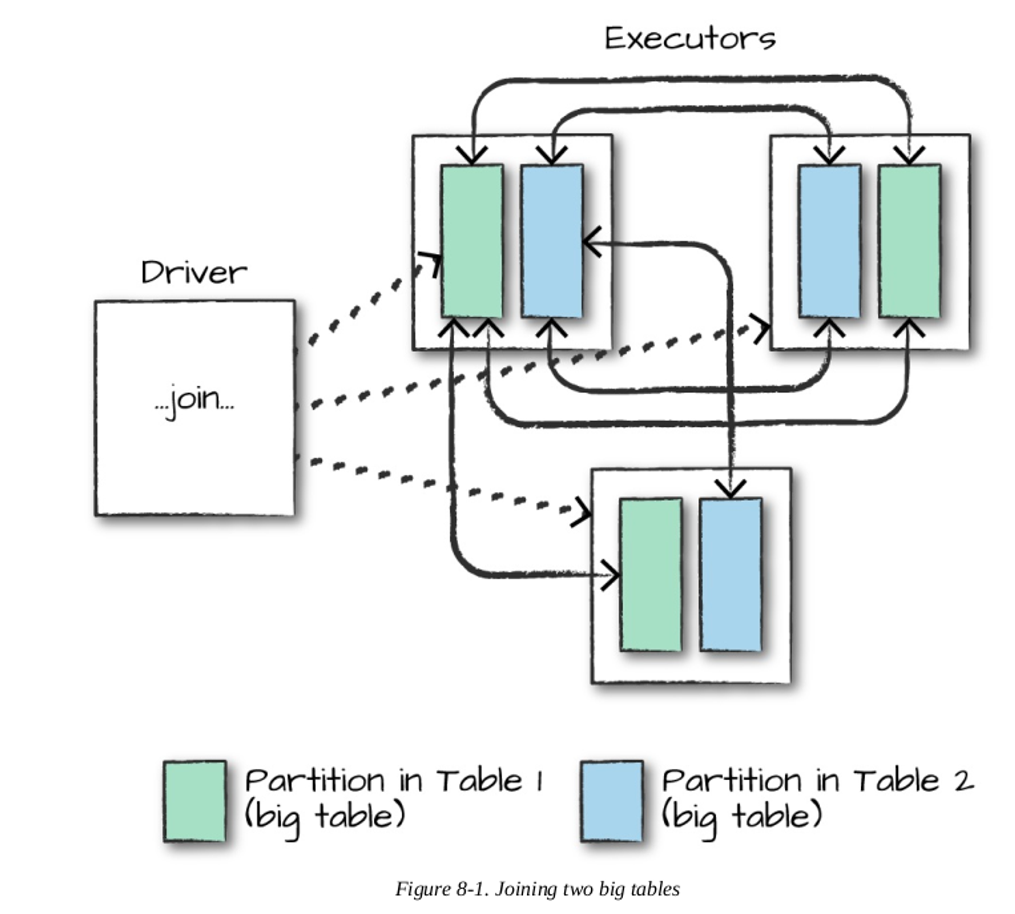 - 두 데이터프레임이 커서, 전체 조인 프로세스가 진행되는 동안 (데이터 파티셔닝 없이) 모든 워커 노드(그리고 모든 파티션)에서 통신이 발생한다.